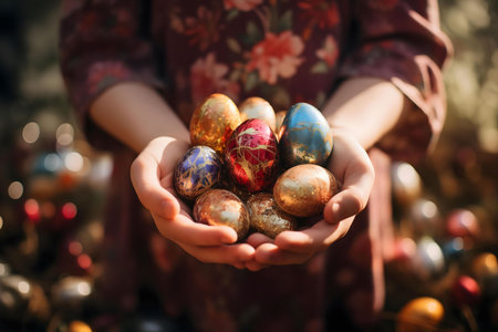A child gently holds a collection of beautifully decorated Easter eggs.