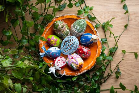 Easter eggs decorated with a different techniques in a beautiful orange bowl surrounded by green leafs.