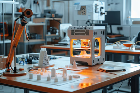 In a cutting-edge laboratory, a 3D printer works diligently alongside various product prototypes on a wooden table, showing advanced engineering techniques.