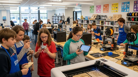 A group of students are actively participating in a technology project, using various tools and devices in a well-equipped library setting.