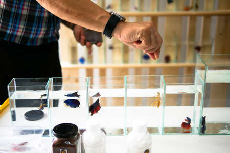 Smart asian men selling siamese fighting fish (betta) are welcoming customers in the shop.