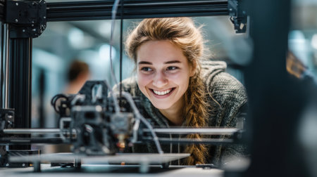 Young woman smiles while observing 3D printer in modern workshop. atmosphere is filled with creativity and innovation, showcasing excitement of technology and design