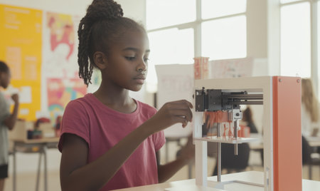 African American student engaging in STEM education, focusing on a 3D printer and an object during a hands on workshop