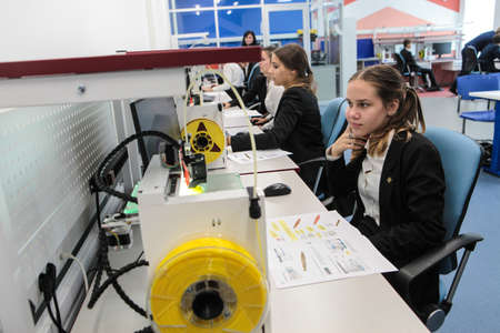 St. Petersburg, Russia- September 20, 2018: State Educational Institution for High School Students Academy of Digital Technologies. Students in a practical lesson are studying electrical networks.