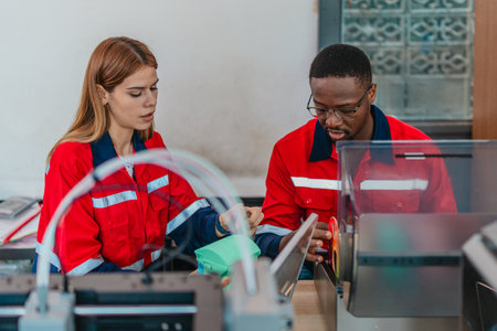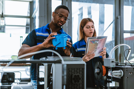 Product design engineer collaborates with industrial designer on 3D printing project in engineering workspace. Interdisciplinary teamwork, innovation, design and engineering in product development