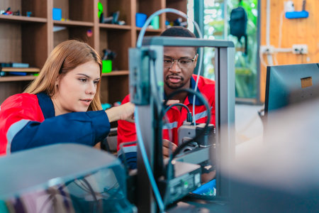 Two individuals are focused on a 3D printer, discussing its components and settings, showing innovation and learning in a high-tech, tool-filled environment.