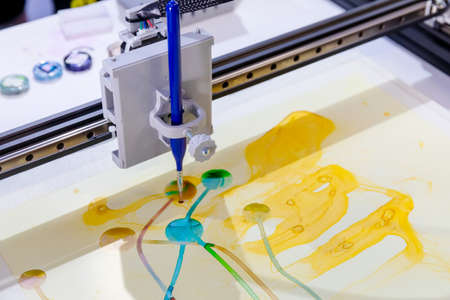 3D printer printing prototype of toy from molten plastic. Process of creating prototype model of toy on 3D printer from yellow melted plastic close-up. Additive new printer technology. Modern printing