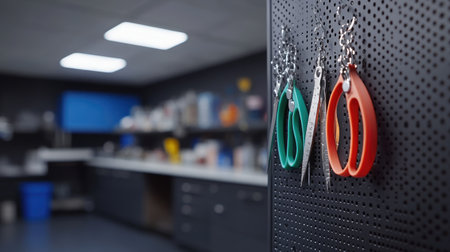 Vibrant scissors hang securely on a pegboard in a contemporary workspace, showcasing a clean and organized environment perfect for crafting or office tasks.