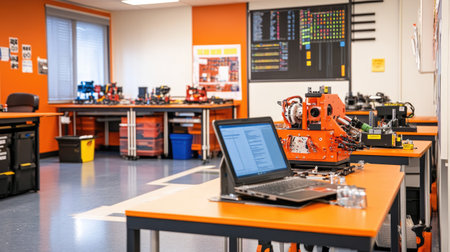 This vibrant engineering workshop features modern technology and organized workspace, equipped with computers and advanced tools, promoting innovation and productivity.