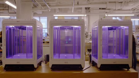 3D Printing Production A manufacturing space where rows of industrial 3D printers create components in various materials from medical implants