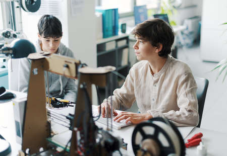 Smart young student learning 3D printing, he is checking the printer