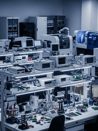 Workshop Table with Electronic Tools and Components in a Modern Lab.