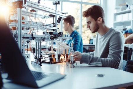 A group of colleagues working together in a robotics laboratory, focusing on the intricate fields of robotics and 3D printing. Showcase their dedication to innovation, as they engage in research, development, engineering, and precision work
