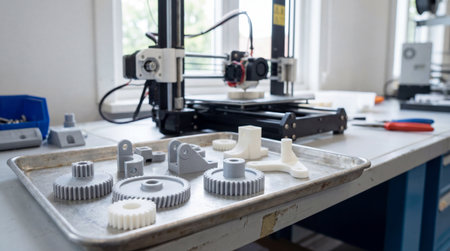 Modern desktop printer creating gray plastic gears and mechanical parts on a workbench in a bright engineering workshop.