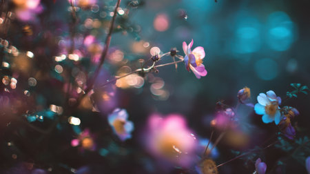 This enchanting floral image features a soft-focus background with delicate flowers, vibrant colors, and dreamy bokeh effects creating a serene atmosphere.