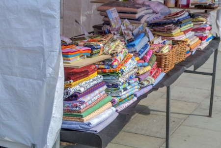 Stack of natural fabrics and textiles lie at a market stand. Sewing industry concept