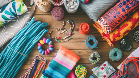 A table decorated with paper flowers, craft supplies, and colorful textiles in shades of green, azure, orange, yellow, and aqua. The vibrant electric blue patterns add an artistic touch AIG50