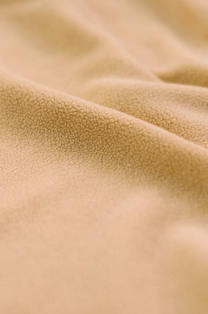 The blanket of furry orange fleece fabric. A background of light orange soft plush fleece material with a lot of relief folds