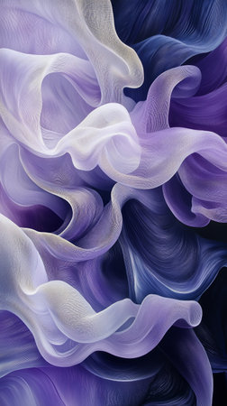 Delicate silk fabrics in purple and white exhibit flowing textures, blending harmoniously together, creating a serene and elegant visual display ideal for fashion or interior design.