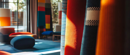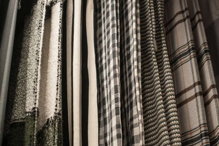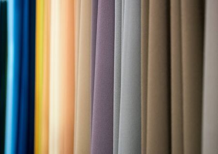 Colorful curtain fabric samples. Multiple color fabric texture samples selection fabrics for interior decoration. Curtains, tulle and furniture upholstery.
