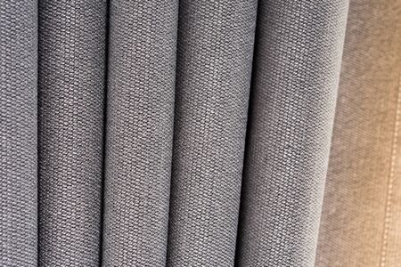 Closeup view of curtain in thin and thick vertical folds made of dense fabric.Textured materials and textiles abstract backgrounds.