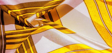 Texture, background, silk fabric with a yellow striped pattern. The design of this fabric is dedicated to a white rabbit mosaic representing the look of a fabulous vest.
