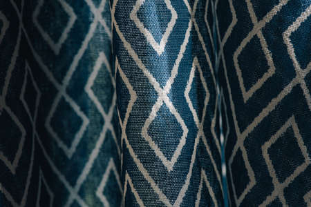 material textile background. Blue fabric in diamonds. Close-up of the white blue diamond shaped fabric textile texture, background. High-quality macro photography.