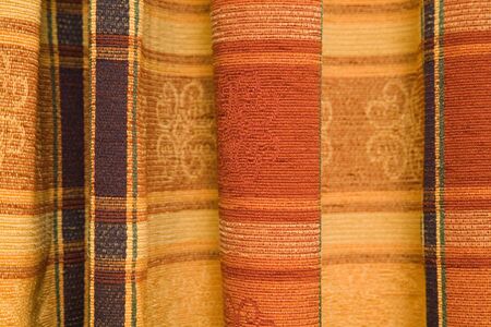 Dense textured fabric for curtains. Fabric samples for curtains in beige, orange and blue colors.