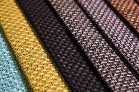 Closeup detail of multi color fabric texture samples. Material color fabric I am in spools of different colors.