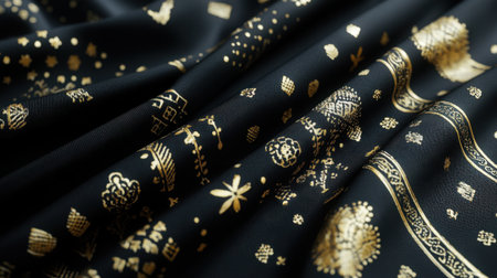 This close-up image showcases a luxurious black fabric adorned with intricate golden patterns, perfect for various fashion and textile projects.