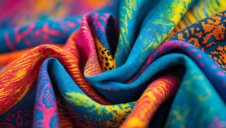 Vibrant multicolored fabric with ornate floral patterns and detailed textures. That the image is generated using AI.