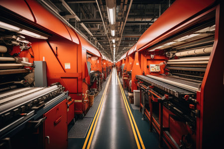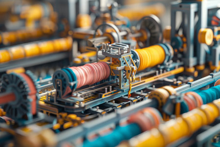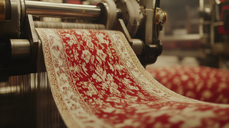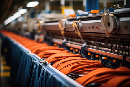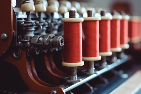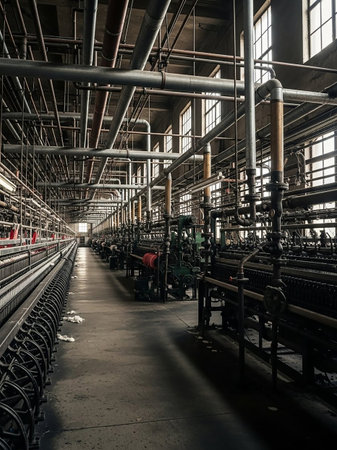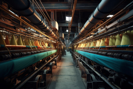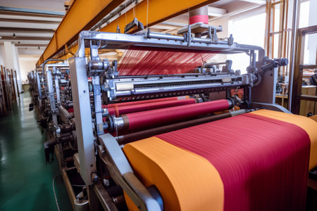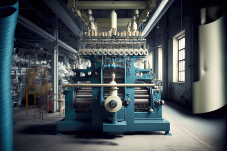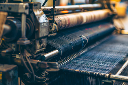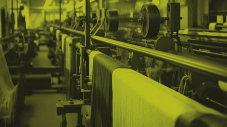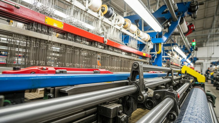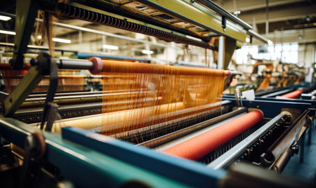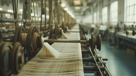 textile industry machinery in a modern workshop, highlighting the intricate details and mechanisms that make up these complex systems.