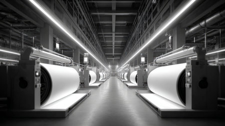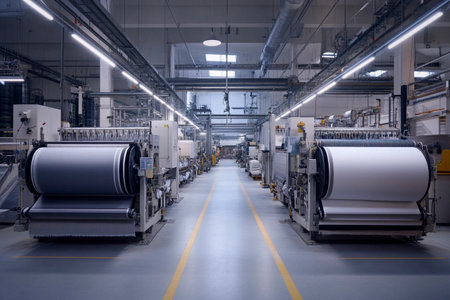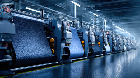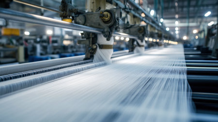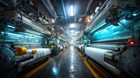 Rows of advanced textile machinery showcase the innovative fabric production process in a large factory. Bright lights illuminate the space, emphasizing the scale and efficiency of the operation.