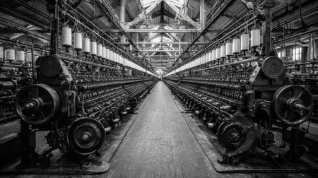 A striking black and white image showcasing the interior of an industrial factory, featuring rows of vintage spinning machines. This photograph captures the essence of manufacturing and craftsmanship in a historical context.