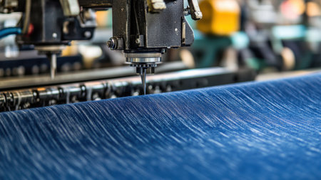 Close-up view of an industrial sewing machine in action, stitching blue denim fabric. This image captures the intricate details of textile manufacturing.