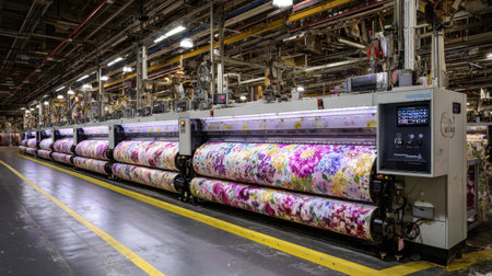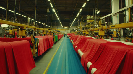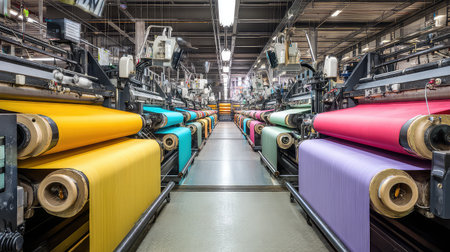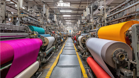 Dynamic view of a large-scale textile factory showcasing colorful fabric rollers and advanced machinery, highlighting efficient manufacturing processes and modern design.