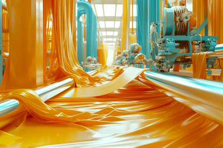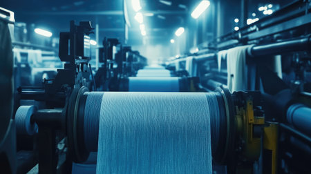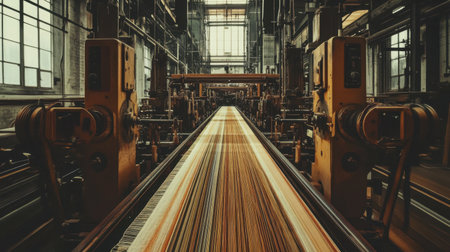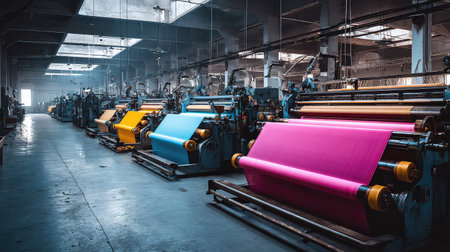 Explore the captivating process of textile manufacturing in an industrial setting, featuring an array of machinery, vibrant fabrics, and a nostalgic atmosphere.