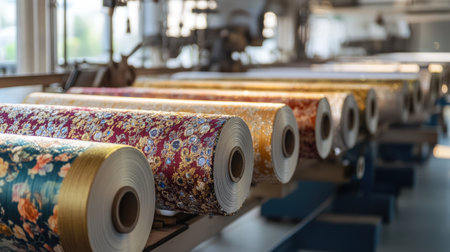 Beautifully arranged rolls of colorful fabric in a textile factory showcase the artistry of textile production in bright natural light, perfect for design inspiration.
