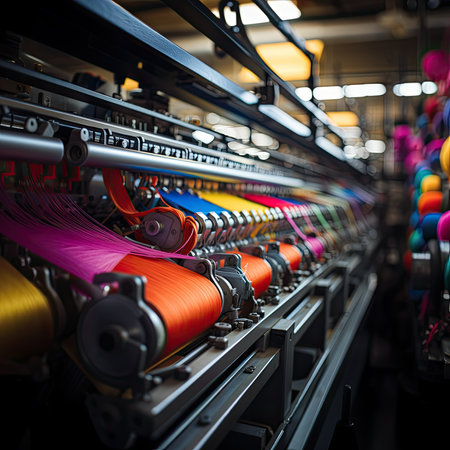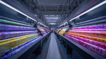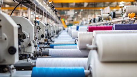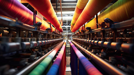 A vibrant textile manufacturing scene shows colorful spools of thread lined up in a factory. This image captures the intricate machinery and detailed production process, highlighting the innovation and craftsmanship in modern textiles.