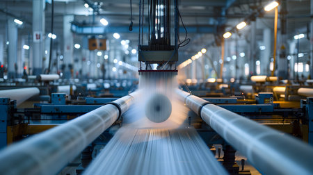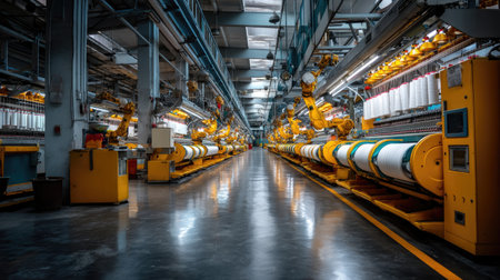 A captivating view of an industrial textile production line filled with spools of thread in a modern factory, showcasing advanced machinery and technology.