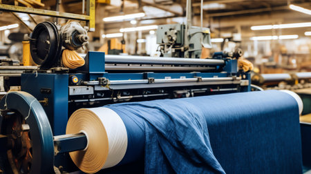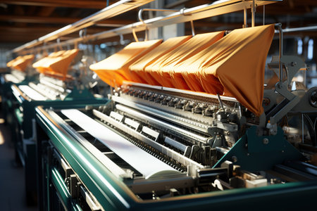 A photo of interior of woven factory with machine working while waving cloth. A machines stand sentinel, their mechanical arms reaching out with precision to manipulate threads and yarns. AIG42.