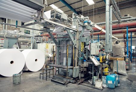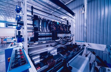 Modern automated production line in factory. Plastic bag manufacturing process. Background