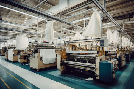 A detailed view of an industrial textile manufacturing workshop showcasing machinery and equipment used for fabric production. The image highlights the intricate processes involved in creating textiles, emphasizing modern methods and workspace dynamics.