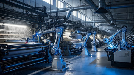 Robotic arms are actively engaged in operating automated textile machinery within a brightly lit factory.