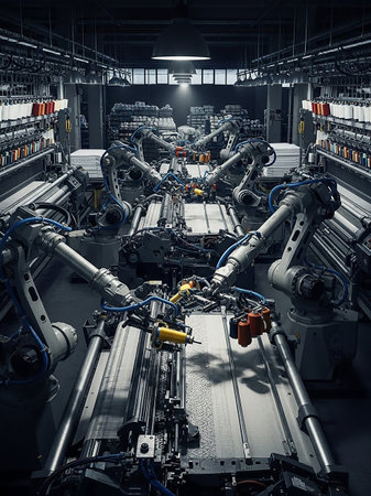 A modern textile factory interior with rows of automated looms and robotic arms actively engaged in production under bright linear lighting.