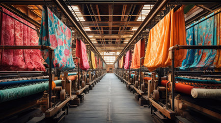 textile factory, with looms producing vibrant and colorful fabrics, created with generative ai
