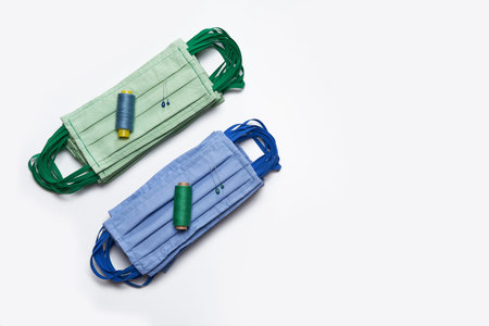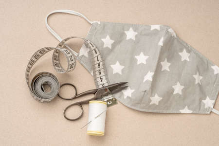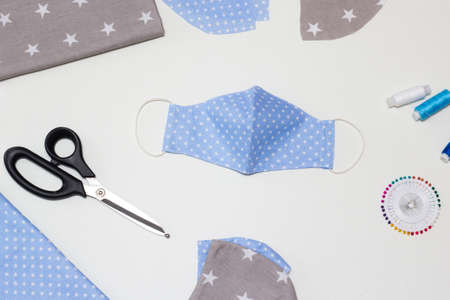 Making a protective medical masks from virus top view. Hand made sewing Reusable mask. Tailor equipment flat lay