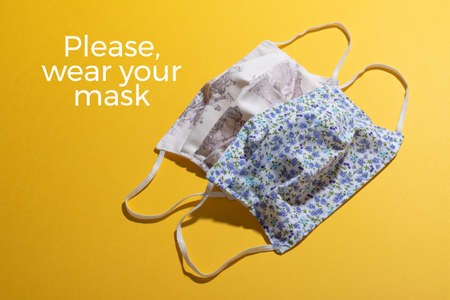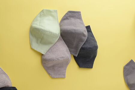Handmade face protective masks on yellow flat lay background. Reusable face masks against virus or flu. Pattern of medical mask