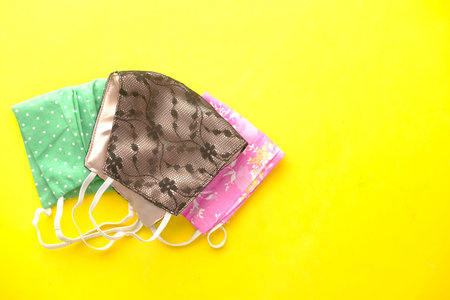 design of fashion face mask handmade from fabric cotton cloth, objects on yellow background