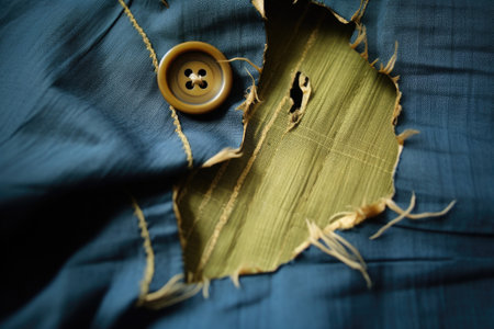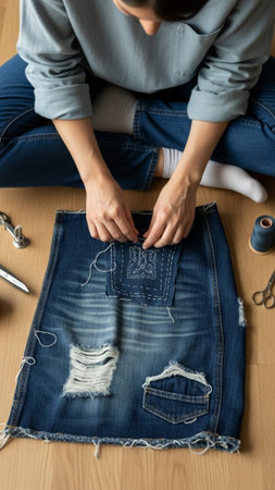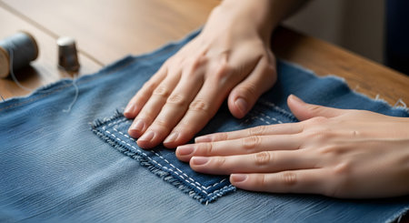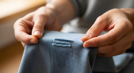 A person skillfully mends a tear in their denim fabric, focusing intently as natural light filters softly through the room.